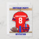 O design branco e azul vermelho customizável do jérsei do ferro da grade do futebol apenas adiciona seus nome e número para criar um convite de aniversário customizável original do futebol do ferro da grade.