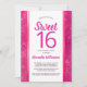 Esta moda e design de vidro feminino ímpar apresenta as palavras, "Por favor, junte-se a nós para uma doce 16 Festa de aniversário virtual para honrar" em roxo rosa-rosa-rosa-quente e preto em sans serif e tipografia de script populares com um olhar letrado, seguido de um nome personalizável e detalhes de festa para que você possa personalizar este convite para seu próprio evento. As palavras estão sobre um fundo branco, bordado por metal escovado cor-de-rosa contra um fundo brilhante e brilhante de diamantes cor-de-rosa quente. A parte traseira apresenta um plano de fundo de diamante correspondente.
