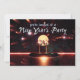 Um convite de festa de Ano Novo com minha imagem de taças de champanhe, fogos de artifício e uma lua cheia.