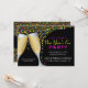 Este Convite de festas colorido de Ano Novo apresenta um gráfico de óculos de champanhe e confete de cor brilhante sobre fundo preto.