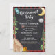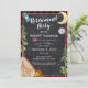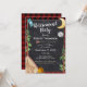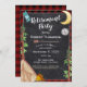 Ataque, acampamento ou glamping, convite à xadrez de búfalos vermelhos e pretos com design de camping estilo chalkboard de meia lua, pinheiros, bússola, mochila, tenda e fogueira. Um convite de festas de aposentadoria ambulante e rústico pode ser personalizado com seu próprio texto e estilos de fonte.