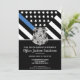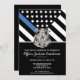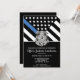 Este design apresenta uma bandeira da força policial com listras pretas e brancas, e também uma faixa com uma linha azul fina. O distintivo da polícia e o texto prateado estão acima de todos os detalhes da festa para a aposentadoria do oficial de aplicação da lei, xerife, capitão ou chefe de polícia que está se aposentando.