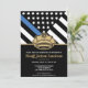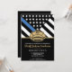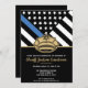 Este design apresenta uma bandeira da força policial com listras pretas e brancas, e uma faixa fina azul também. O chapéu da polícia e o texto em dourado ficam acima de todos os detalhes da festa para o oficial de aplicação da lei que se aposenta, xerife, capitão ou detalhes da festa de aposentadoria dos chefes.