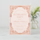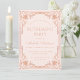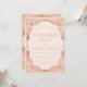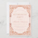Este convite de festa de aposentadoria rosa e dourado-rosado com um ar vintage, recomendado para uma mulher, tem uma moldura ornamentada (falsa) em folha de ouro rosa com decorações barrocas elegantes sobre um fundo rosa-bege. O nome é escrito em uma caligrafia elegante. Todo o texto pode ser personalizado e tem uma cor rosa semelhante à moldura dourada-rosada.