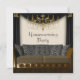 Convite de festa de aquecimento da casa com sofá de leopardo e zebra modernos e lustre.