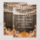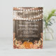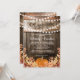Convites de festa de aquecimento de casa rústica de outono com fundo de barril de carvalho de celeiro country, luzes de corda cintilantes, folhas de outono, uma abóbora de colheita e um modelo de festa em casa doce lar que é fácil de personalizar.