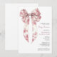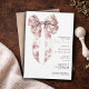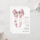 Um convite de chá de bebê com laço de coquette em toile rosa apresentando uma ilustração de laço elegante inspirada em vintage que traz um toque romântico suave para a celebração. A delicada arte do laço combinada com tipografia clássica cria um visual gracioso que parece ser atemporal e elegante para dar as boas-vindas a uma menina. Inspirado na estética coquette popular e nos motivos tradicionais de toile, este design carrega uma qualidade suave de herança que funciona lindamente para chá de bebê encantadores. Uma escolha adorável para anfitriões que planejam um chá de bebê de menina, reunião inspirada em vintage ou celebração rosa doce onde a elegância feminina e o estilo clássico de livro de histórias se unem. Disponível para impressão, como download digital ou ambos.