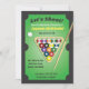 Este convite maravilhoso é ótimo para uma festa de aniversário, despedida de solteiro ou qualquer tipo de celebração ou evento. O design é de uma mesa de bilhar com bolas, taco e mesa de sinuca.