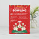 Convite de festas de Natal de Férias. Junte-se a nós para uma festa de boliche festiva! Este convite apresenta um design divertido com chapéus de Papai Noel em um alfinete de boliche e chifres de renas em uma bola de boliche vermelha, todos colocados contra um fundo de neve cheio de flocos de neve. A frente da placa tem um fundo vermelho, enquanto a parte traseira é preta. Sinta-se livre para personalizar o convite com suas informações. Não se esqueça de vestir seu suéter mais feio e trazer um presente para nossa troca!