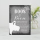 Celebre sua festa de Halloween com um convite divertido de Boos e Booze. O convite para o Halloween apresenta um fundo negro e cinza, teia aranha, fantasma, e as palavras "Boos & Booze" em um estilo divertido e tipográfico.