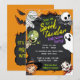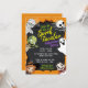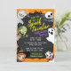 Coloque a palco para uma comemoração espetacular com este convite de festas de crianças de Halloween brincalhão! Ele apresenta personagens adoráveis como bruxas, fantasmas, esqueletos, e mais, todos trazidos à vida com cores vibrantes e um design impressionante. A mistura de fontes atraentes e layout claro torna isso divertido e funcional, dando a você espaço suficiente para todos os detalhes importantes. É o convite perfeito para dar o tom para uma festa memorável de Halloween!