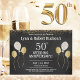 Convite para Festas de casamento de Ouro de 50 anos. Projetado para um casal especial 50º Aniversário, este cartão é decorado com balões brancos e dourados e confete dourado sobre fundo preto, com texto branco. Para personalizar, basta substituir o nome do exemplo e as informações do evento usando nosso modelo passo a passo fácil. Certifique-se de ver a faixa de Festa de casamento do Ouro de 50 anos correspondente.
