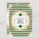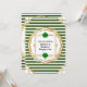 Um belo design de listras horizontais verde floresta e branco emolduradas por uma borda de vieiras em ouro falso sobre branco. Há dois trevos de quatro folhas verdes na frente, dando uma sensação de elegância e estilo.