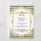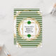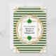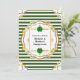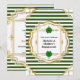 Um belo design de listras horizontais verde floresta e branco emoldurado por uma borda de vieira em ouro falso sobre branco. Existem dois trevos de quatro folhas verdes na frente, dando uma sensação de elegância e estilo.