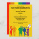 Jogue sua própria festa de celebração de orgulho gay ou outro evento especial. Esses convites estão prontos para serem personalizados com todos os detalhes do seu partido e apresentam uma ilustração de estilo moderno de um grupo de pessoas marchando em uma orgulho gay nas cores do arco-íris da bandeira clássica do orgulho com uma pessoa vermelha, laranja, amarela, verde, azul e roxa, alguns dos quais são sinais de carregando. O gráfico é colocado sobre um fundo de cor dourada. O reverso coordena as listras do arco-íris.