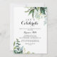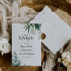 Este convite de festas de celebração de vamos caligráfico moderno verde é perfeito para uma festa de noivado tropical, festa de solteira, aposentadoria, graduação, casamento após festa ou qualquer evento ou festa. A design apresenta folhas tropicais predominantemente verdes com um toque de flores rosadas cor-de-rosa bem dispostas em coroas elegantes e formas geométricas.
