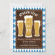 Festa de Oktoberfest (Octoberfest) festival de tipografia branca, bandeira azul bávara, comemora o festival tradicional alemão de cerveja bávaro. Um convite moderno misturado com madeira rusticada castanha com tipografia branca Oktoberfest sobre o padrão de diamante azul bandeira bávaro com pintas ilustrativas de cervejas e tipografia rústica.
