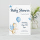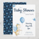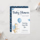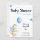 Convite de festas de chá de fraldas de dragão bonito com ilustração de um dragão doce em cores creme e azul. Ilustrada e projetada por Patricia Alvarez.