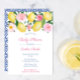 Limões de aquarelas vibrantes e folhas verdes brilhantes com rosas de aquarelas cor rosa bonito e peônias, complementadas por azulejos azul e branco de cobalto.