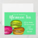 Um chá de tarde, ou chá de manhã, bonito e colorido, totalmente personalizável, ou um convite de chá alto, adequado para qualquer pessoa que esteja a receber um chá de tarde ou de manhã. Este design bonitinho tem uma foto de fatias de macarão ou bolos de macarrão coloridos contra um fundo de cinza - a cor de fundo é personalizável.