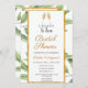 Este design de convite de festas de Chá de panela de Encantamento de Champanhe apresenta dois vidros de champanhe em um brinde para amar. Uma elegante estrutura geométrica de ouro com sotaques botânicos de folha verde rodeia o texto. Personalize este acessório de casamento com o nome da noiva e todas as suas informações de evento, como rsvp, endereço e onde a noiva a ser está registrada.