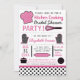 Os convites de festas de chás de panela temáticos do cozinhar de cozinha moderno apresentam tipografia, acessórios e utensílios de cozinha e padrões de bolinhas em um esquema de cores preto, rosa e branco.