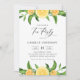 Convide familiares e amigos para o seu evento com este convite de festas de chá cítrico personalizável. Apresenta ilustrações de cor d'água de limões, clementinas, florais e verde. Este convite cítrico será perfeito para o tema cítrico e eventos de verão. Personalize adicionando os detalhes do evento.