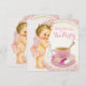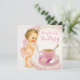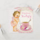 Convite de chá de bebê para menina com adorável bebê vestindo calças de babados rosa e colar de pérolas. Este adorável convite de chá de bebê com xícara de chá rosa pérola é facilmente personalizado para o seu evento adicionando detalhes do evento, estilo de fonte, tamanho e cor da fonte e texto.