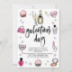 O convite de festas do dia desta linda galentina apresenta um fundo cor-de-rosa com uma garrafa e óculos de champanhe, artigos de maquilhagem como batom, pincel, esmalte de unhas e loção e bolsa/bolsa, cupcake e estrelas. O verso apresenta um fundo cor-de-rosa com padrões de estrelas em cores pastel. Personalize para suas necessidades. Você pode encontrar mais produtos correspondentes na minha loja.