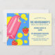 O convite para CHURRASCO social de morango com um tema de verão. Concebidos com um picolé cor-de-rosa e alguns morangos vermelhos e plasmas de tinta amarela.