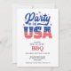 Festa de 4 de julho bonita convida com fotos de picolés vermelhos, brancos e azuis no topo. A frase "pop on over" está escrita em letras azuis fortes, e o nome do seu filho, a idade e as informações da festa são mostrados abaixo. Os convites para o aniversário de 4 de julho invertem-se para mostrar um padrão de aspersão vermelha e branca.