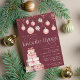 Convide amigos para uma festa de Natal ou de Natal com temas favoritos com este convite elegante e festivo, com ilustrações de aquarelas em tons suaves de rosa pincelado num fundo rico de ameixa de açúcar. Seus detalhes favoritos da festa são tocados por uma granja de ornamentos brancos cor-de-água rosa, e flanqueados por uma pilha de presentes de Natal embrulhados. Personalize com os detalhes do seu partido, incluindo instruções para os seus hóspedes sobre quantos presentes trazer e o seu valor estimado.