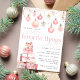 Convide os amigos para uma festa de Natal ou de Natal com temas favoritos com este convite elegante e festivo, com ilustrações de aquarelas em tons suaves de rosa-pincel. Seus detalhes favoritos da festa são tocados por uma granja de ornamentos brancos cor-de-água rosa, e flanqueados por uma pilha de presentes de Natal embrulhados. Personalize com os detalhes do seu partido, incluindo instruções para os seus hóspedes sobre quantos presentes trazer e o seu valor estimado.