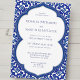 Este convite de festa de noivado elegante apresenta um impressionante design de azulejos mediterrâneos azuis e brancos, enquadrado em uma forma arqueada graciosa que adiciona um toque atemporal e sofisticado. O padrão intrincado evoca charme costeiro clássico, enquanto a tipografia limpa mantém o layout refinado e fácil de ler.