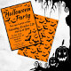 Um convite de festas preto e laranja de Halloween com morcegos.