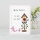 Casinha de pássaros bonitos e pássaros cor-de-rosa em uma camada branca escamoteada em frente ao gingham rosa - um convite de festas bonito e casual para o lar