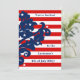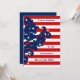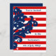 Convites de festas elegantes do dia da independência que medem 5x7". Estes têm listras vermelhas e brancas, e um motivo damasco azul no lado esquerdo com algumas estrelas brancas aqui e ali. Adicione seus detalhes a ambos os lados.