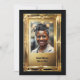 Uma elegante imagem de ouro em negrito parece brilhar e brilhar contra um fundo preto que tem um modelo fotográfico para uma fotografia do seu funcionário. Abaixo está uma fonte para o seu texto personalizado. A parte traseira tem a mesma borda do ouro com modelos pretos em negrito que podem ser personalizados de acordo com suas necessidades. Esta design é adequada a um almoço de negócios de despedida ou a uma festa de aposentadoria.