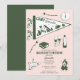 Um design desenhado à mão com ilustrações de tema de acampamento de despedida de solteira. Este design verde e rosa de acampamento de fim de semana é ideal para fins de semana de acampamento de luxo, festas de despedida de solteira em viagens de amigas em destinos de montanha, floresta ou lago.