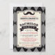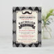 Um convite de despedida de solteiro elegante com um fundo argyle, um bigode da moda e as palavras "POR FAVOR, JUNTE-SE A NÓS PARA UMA NOITE DE GENTLEMEN NA CIDADE EM HOMENAGEM AO" tipograficamente estilizado. Personalize facilmente com os detalhes do evento.