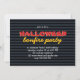 Design de festa de aniversário de Halloween com a menção "festa de fogo de halloween", sobre uma faixa horizontal a preto e azul/fundo listrado. Nas cores vermelha, amarela e laranja, a design é excelente para uma festa de aniversário de menino adolescente. Personalize facilmente com os detalhes da sua festa e cores/fontes favoritas.