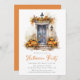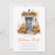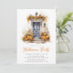 Convide convidados para a celebração do Dia das Bruxas com estes convites festivos para festas de Halloween. O design apresenta uma ilustração encantadora de aquarela de uma varanda frontal com uma porta preta decorada com pinos, abóboras, lanternas e folhagem de queda. Personalize com seus detalhes de evento — perfeito para festas de Halloween, casas abertas ou qualquer reunião de outono, simplesmente atualizando o texto.