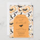Este convite festivo apresenta morcegos pretos e luas de crescente laranja. As palavras "fantasias e cocktails" são escritas em letra moderna. É a maneira perfeita de convidar seus amigos para uma festa assustadora de Halloween onde eles podem vir vestidos com seus fantasias e desfrutar de um delicioso coquetel de Halloween.