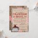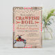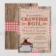 Este design de estilo rústico apresenta um fundo de madeira com fita vermelha e branca. Sobre isso, há uma textura de aniagem com um lagostim ilustrado em desenho animado. A fonte serifada e manuscrita vermelha e preta é totalmente personalizável para o seu evento, seja um cozido de lagostim, lagosta, frutos do mar ou peixe. Celebre seu noivado, aniversário, formatura ou qualquer evento com estilo!