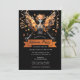 Festa de fantasia de Halloween, um crânio assustador, em laranja e preto. O plano de fundo apresenta um contorno de rosa preto e laranja em apuros que corresponde aos rosas no topo da cabeça do crânio. Design composto por Designs Holiday Hearts.