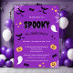 Festa de Crianças Bonitas do Halloween Convite com fantasmas brancos, abóboras, teias de aranha e morcegos contra um pano de fundo roxo brilhante. Também disponível como download digital.