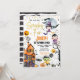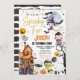 Bonito convite de aniversário em estilo. Tema: Festa de fantasias de monstros de Halloween. Ocasião: Festa de primeiro aniversario infantil ou menina. Estilo: Bonito, Cheio, Divertido, Louco. Cores: Laranja, roxo, branco, ouro. Gráficos: monstros de Halloween, vampiros, múmia, bruxa, fantasma, Frankenstein, lua de cheio, morcego, castelo de casa assombrado, abóbora.