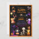 Este convite de festa de fantasia de Halloween em preto apresenta personagens fofos, como esqueleto, bruxa, um batman, uma garota assustadora e um monstro com olho, muitas abóboras, aranhas, uma coruja, um morcego, um gato e um corvo em fundo preto com elementos em laranja, azul e roxo brilhantes. Ótimo convite para usar para dar uma festa de Halloween. Disponível para impressão e/ou download. Fácil de compartilhar nas redes sociais ou por e-mail.