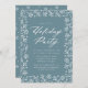 Convite para festas simples e elegante com uma fronteira de flocos de neve brancos e galhos de pínus em um fundo azul fosco. "Festa de Feriado" é exibido em um script de caligrafia branco em negrito com os detalhes de sua festa mostrados abaixo. A festa de festas de neve convida a reverter para exibir um lindo padrão de flocos de neve.