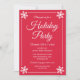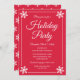 O design de convite para festas festivas apresenta o texto elegante do roteiro "Festa Feriada" e os detalhes de celebração que podem ser totalmente personalizados, enquadrados por uma borda de floco de neve na moda. Este design lado apresenta um padrão de floco de neve no lado oposto. A cor de fundo vermelha de feriado pode ser modificada através de Personalizar.